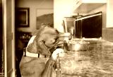 Dog stealing food from kitchen counter. Cute puppy dog with head tilted over pet food bowl with raw chicken or wet dog food. Funny counter surfing and bad dog behavior or habit. Selective focus.