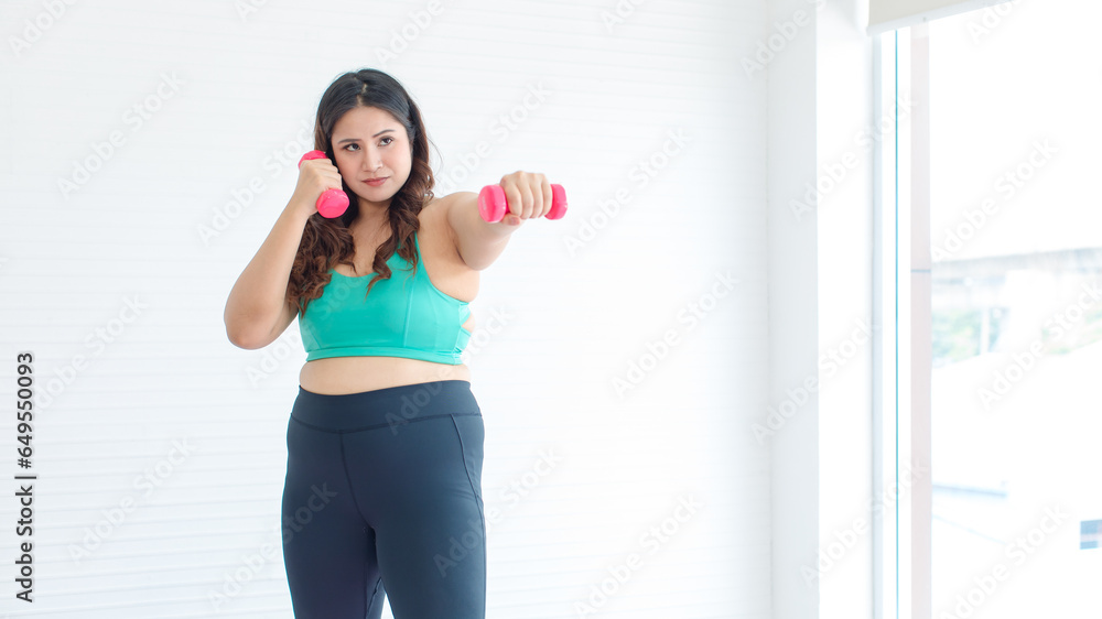 Asian young chubby fat healthy oversized overweight fit female sportswoman in casual sportswear and boxing gloves standing on yoga mat smiling punching air exercising training in home fitness gym