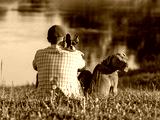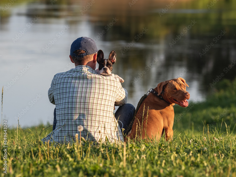 Charming dog, cute little puppy and attractive man sitting on the river bank on a clear, sunny day. Closeup, outdoors. View from the back. Day light. Concept of care, training and raising pets