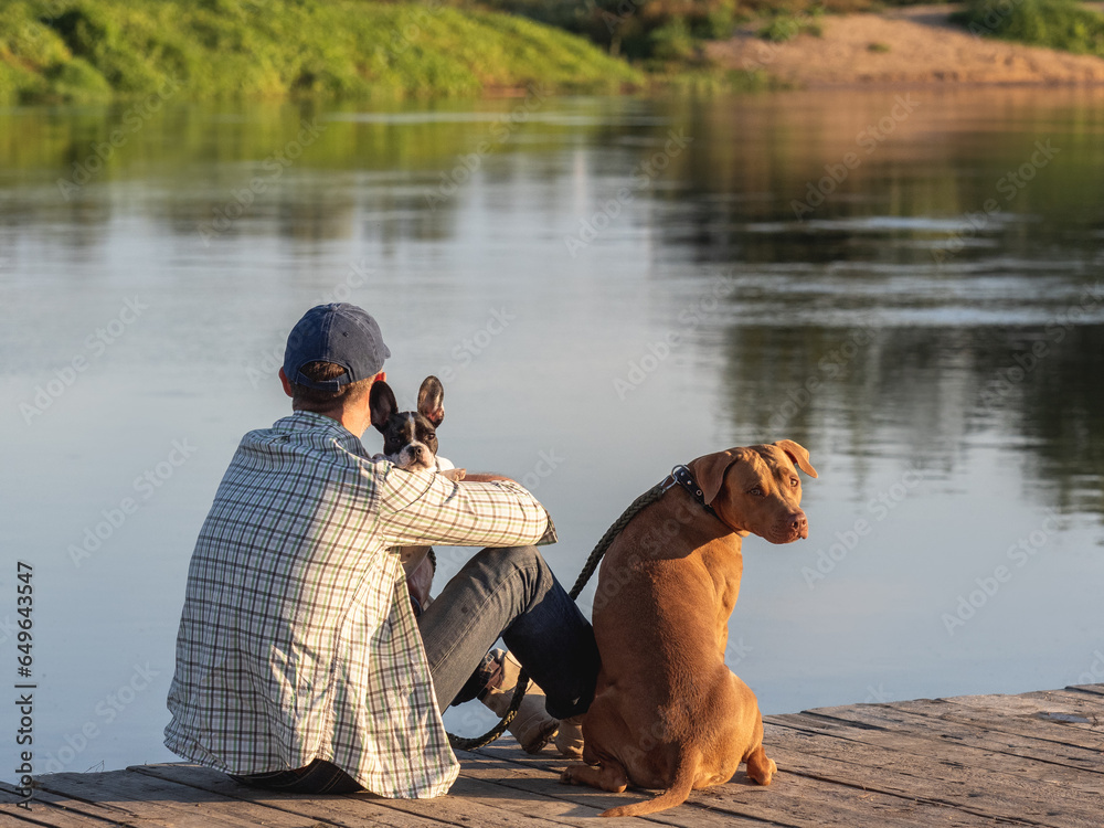 Charming dog, cute little puppy and attractive man sitting on the river bank on a clear, sunny day. Closeup, outdoors. View from the back. Day light. Concept of care, training and raising pets