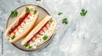 Hot dog with sausage in a bun with sauces on a light background, Fast food menu for kids, Long banner format. top view