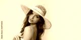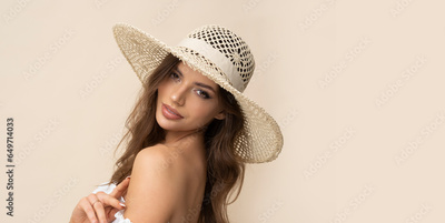 Very beautiful young woman in straw hat and white boho dress on creamy background.