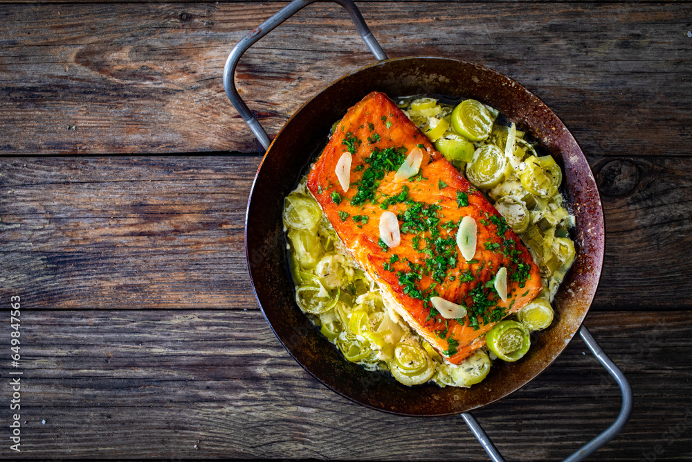 Fried salmon steak with cooked leek and garlic on frying pan on wooden table