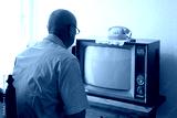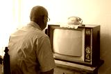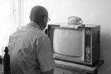elderly man turns on and watches old retro analog TV with blank screen for designer, white background, 1960-1970, stylish mockup, template for video, Retro Technology in Everyday Life