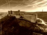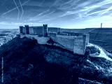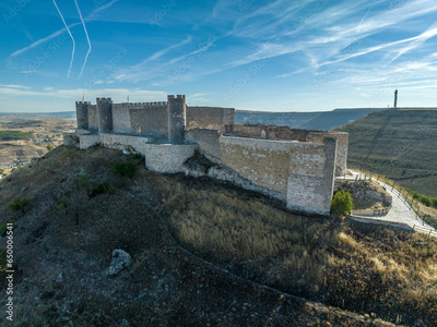 Aerial view of restored Jadraque medieval hilltop castle in Spain in in the province of Guadalajara, Castilla La Mancha, above the Henares river, with concentric towers blue sky with jet streams