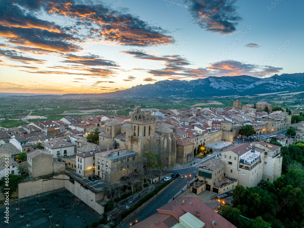 Aerial view of Laguardia medieval fortified hilltop village surrounded by vineries in the Rioja region of Spain, with colorful sunset sky