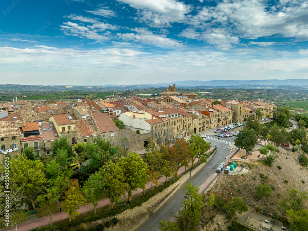 Aerial view of Laguardia medieval fortified hilltop village surrounded by vineries in the Rioja region of Spain, with blue cloudy sky