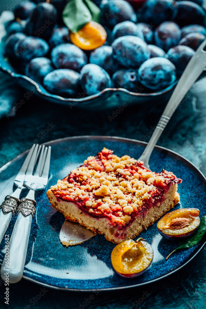 Homemade vegan German plum cake (Zwetschgenkuchen) with yeast dough and crumbles