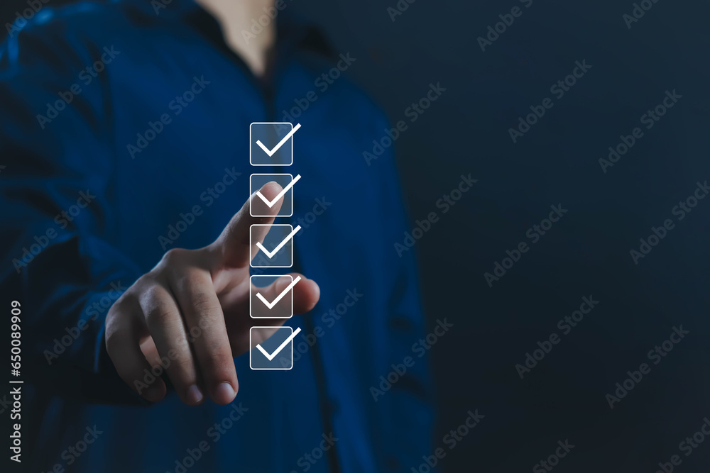 Businessman showing check mark summarizing work details, checklist, documents and online quality assessment standards.