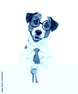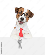 Smart Jack russell terrier puppy wearing eyeglasses and necktie holds in his paw the keys to a new apartment over a blank banner. Isolated on white background