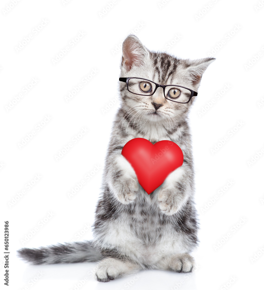 Smart tabby kitten wearing eyeglasses holds red heart. isolated on white background