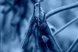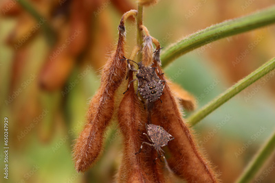 Close-up of many brown marmorated shield bugs on soybean plant with copy space. Halyomorpha halys insect at nymph stage in italy