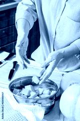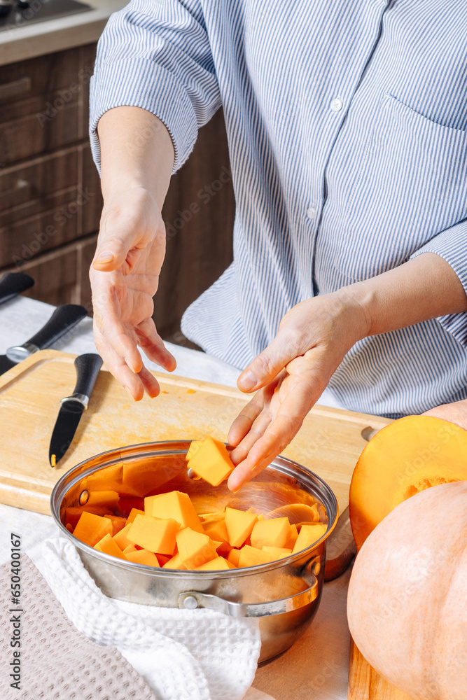 Senior Caucasian woman putting chopped pumpkin pieces into a bowl