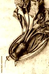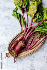 Fresh raw beets with leaves on a rustic metal dish on a gray background