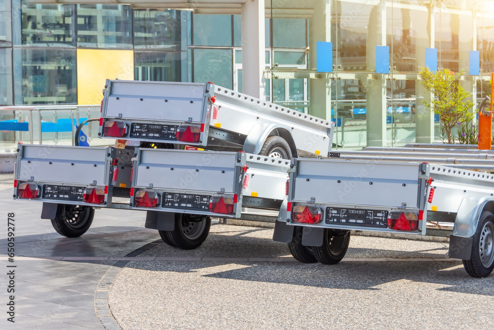 Several new small trailers for cars for personal use, for sale in a hardware store, home transportation delivery. Service production and maintenance equipment.