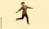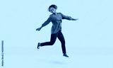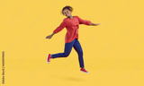 Happy young black woman having lots of fun in the studio. Cheerful carefree African American girl wearing comfortable blue jeans jumping high in the air isolated on a vibrant yellow colour background