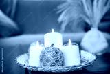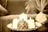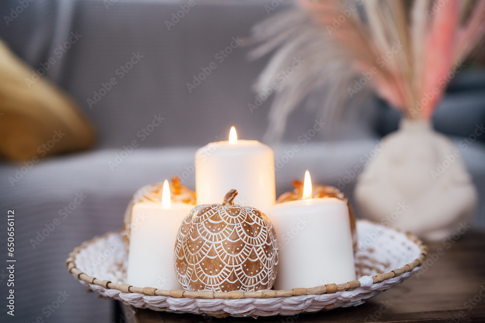 Autumn fall cozy mood composition for hygge home decor. Orange pumpkins decorated with mandalas, white burning candles on wicker plate on the coffee table in the living room. Selective focus