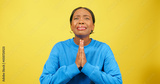 Emotional young woman prays and pleads, begging and upset, yellow studio