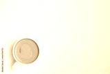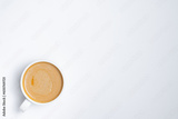 Cup of cappuccino coffee on a plain white table background. Cozy flatlay and top view. Coffee mug and breakfast routine. Minimalist concept