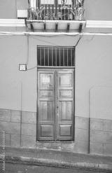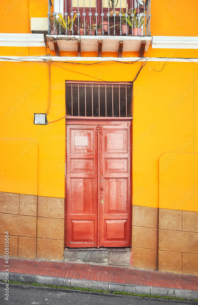 Street view of the facade of an old colonial building, Quito, Ecuador.