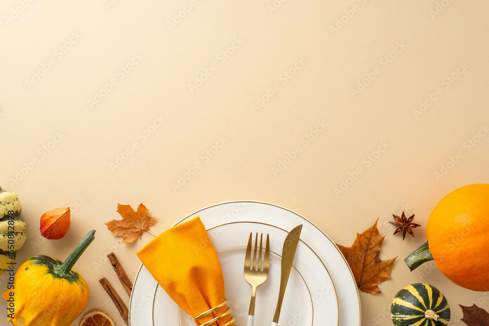 Above view captures essence of family Thanksgiving dinner with gilded tableware, classic cutlery, and autumnal decorations rest on a beige isolated background, inviting text or promotional content