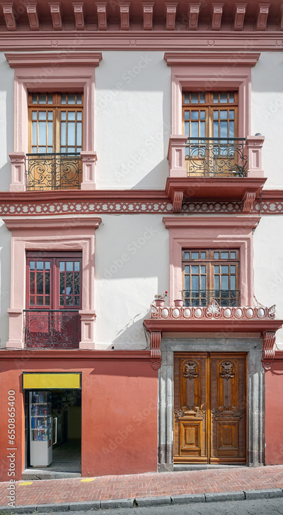 Street view of the facade of an old colonial building, Quito, Ecuador.