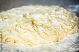 Texture of rolled dough. Background of the dough for baking. Fresh raw dough for pizza or bread baking. Close-up fermented doughs, homemade. Macro selective focus raw dough texture backdrop