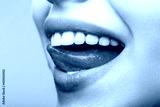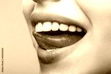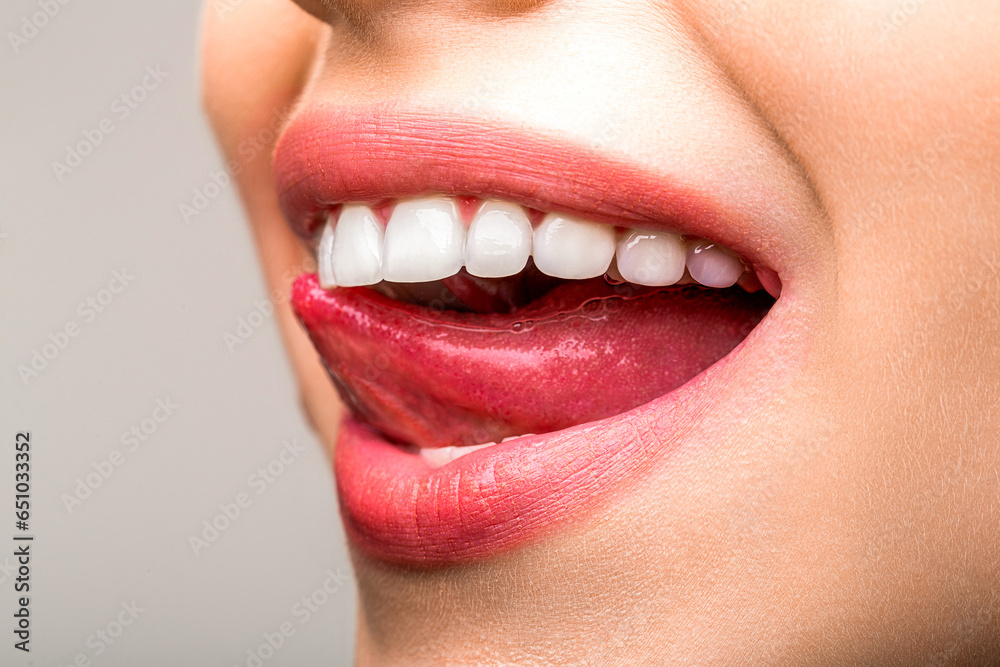 Closeup shot of woman's toothy smile. Perfect healthy teeth smile woman. Dental health concept. Teeth whitening procedure. Dental care. Woman tongue seductively licking lips. Beautiful chubby lips