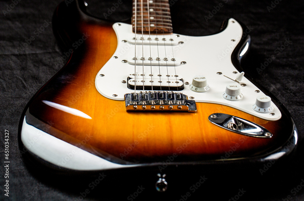 Stringed electric musical instrument. Musical instrument for rock, blues, metal songs. Guitar strings, close up. Electric Bass Guitars. Electric guitar. Close up of music guitar