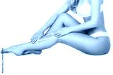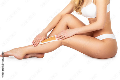 Close-up waxing woman leg in spa. Beautician waxing female legs in spa center. Well-groomed woman legs after depilation isolated on white background. Waxing woman leg with wax strip at beauty spa