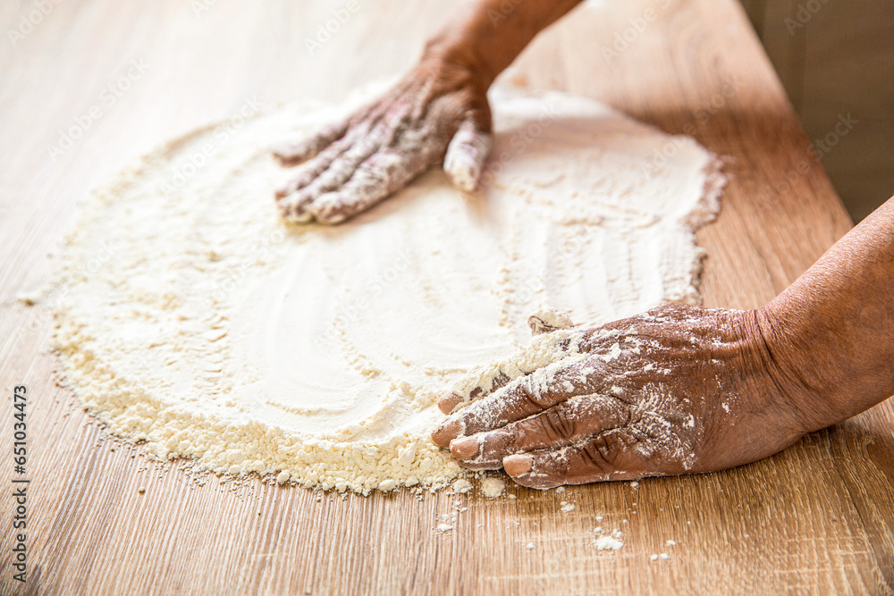 Women's hands, flour and dough. Woman preparing dough for home baking. Dough on white powder covered table. Hand flour. Hands baker with flour in kitchen. Hands woman covered in flours
