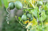 Green striped fruits of Melotria scabra similar to a small watermelon with a cucumber flavor. Organic gardening concept.