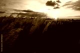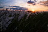Landscape view Icon of Autumn. Blooming Kans grass (Saccharum spontaneum) flower field with Golden-hour Sunset