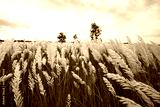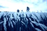Landscape view of Autumn Icon. Blooming Kans grass (Saccharum spontaneum) flowers field with cloudy blu sky