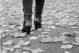 Young adult woman legs in black dark leather boots walking in autumn day. Asphalt covered with fallen yellow fresh and lush maple leaves. Back view. Go away. Closeup.