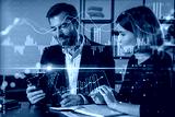 Businesspeople working together at office workplace. Concept of team work, business education, internet surfing, brainstorm, project information technology. Financial charts icons