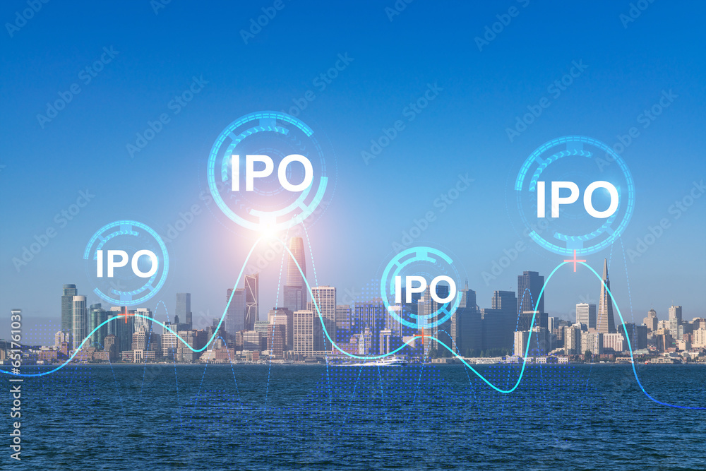 Skyscrapers Cityscape Downtown View, San Francisco Skyline Buildings. Beautiful Real Estate. Day time. IPO hologram. Business education initial primary offering concept.