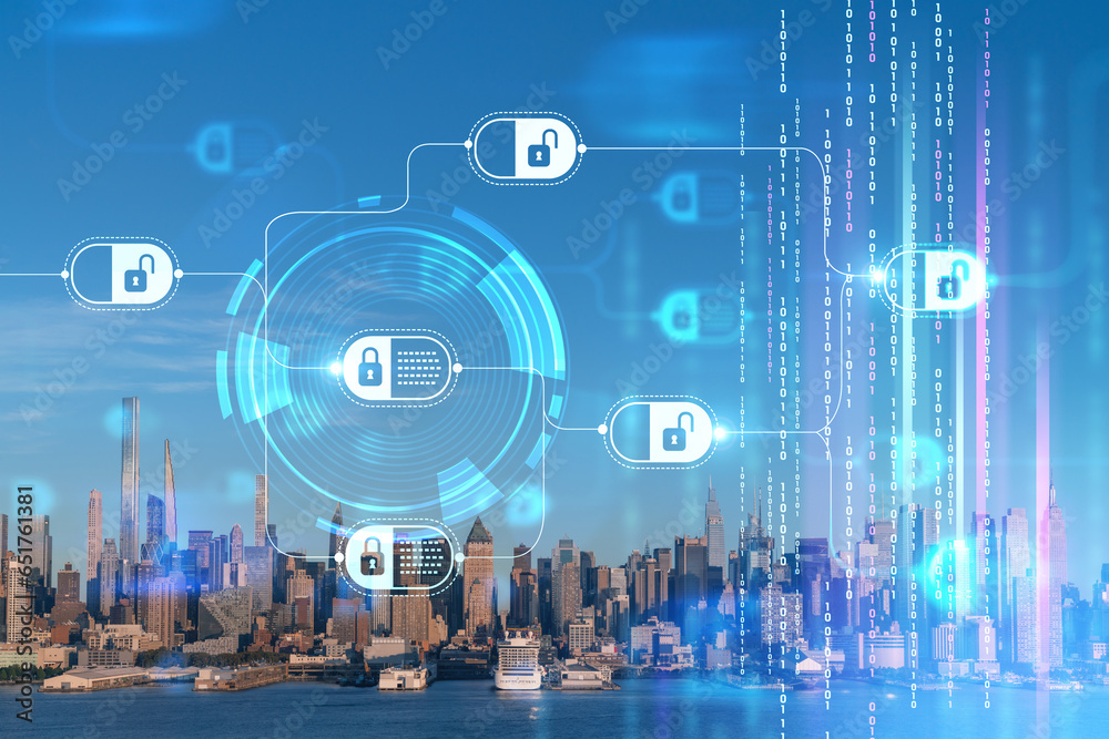 New York City skyline from New Jersey over Hudson River, Midtown Manhattan skyscrapers at sunset, USA. Decentralized economy. Blockchain, cryptography and cryptocurrency concept, hologram