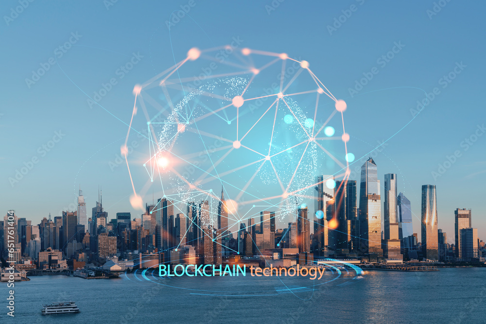 New York City skyline from New Jersey over Hudson River with Hudson Yards skyscrapers at sunset. Manhattan, Midtown. Decentralized economy. Blockchain, cryptography, cryptocurrency concept, hologram