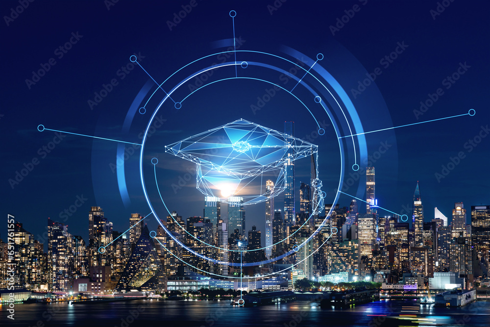 New York City skyline from New Jersey over the Hudson River with the skyscrapers at night, Manhattan, Midtown, USA. Technologies, education concept. Academic research, top ranking university, hologram