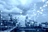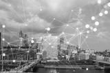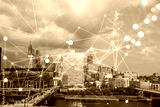 Aerial panorama city view of Philadelphia financial downtown at day time, Pennsylvania, USA. Glowing Social media icons. The concept of networking and establishing new connections between people