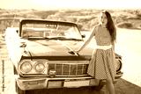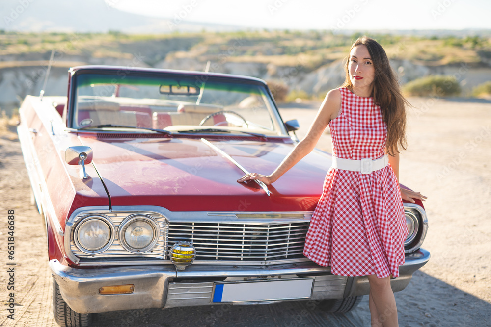 beautiful girl in a retro dress at sunrise happy posing on the background of the mountain landscape in Cappadocia near a red retro car