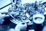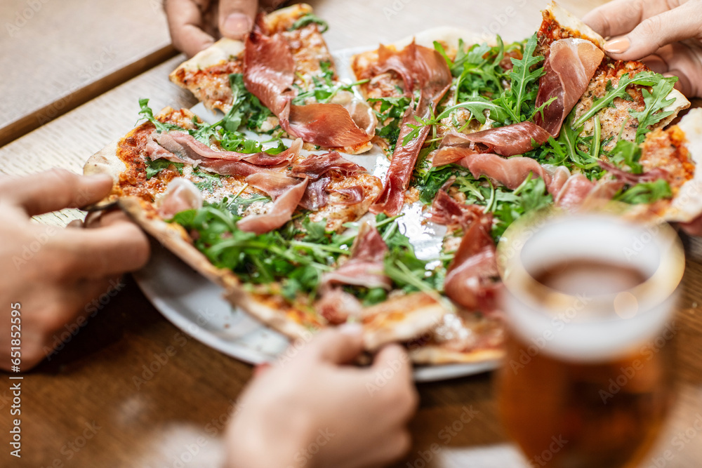 leisure, food and drinks, people and holidays concept - close up of friends eating pizza at restaurant or pub
