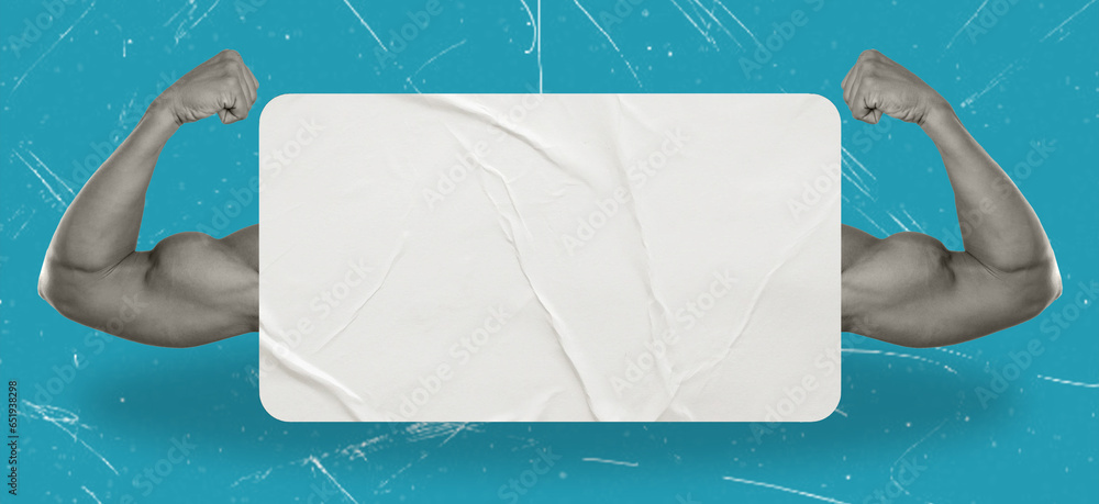 Modern art collage depicting muscular arms holding a dialog bubble. Concept of communication, news, chat.