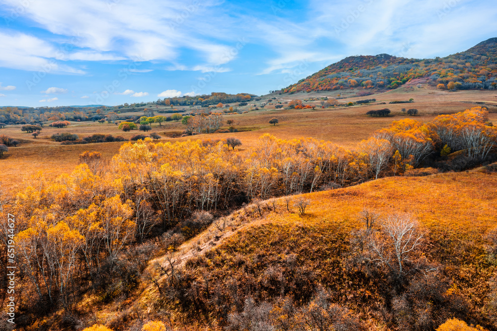 Beautiful grassland nature landscape in autumn. Birch trees and yellow grass in nature park.