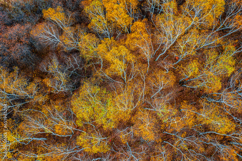Aerial view of colorful birch tree nature landscape in autumn. top view.