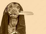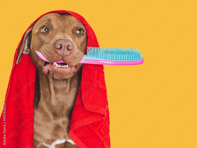 Cute brown dog, red towel and hairbrush. Closeup, indoors. Studio shot, isolated background. Concept of care, education, obedience training and raising pets