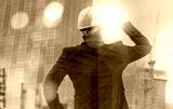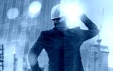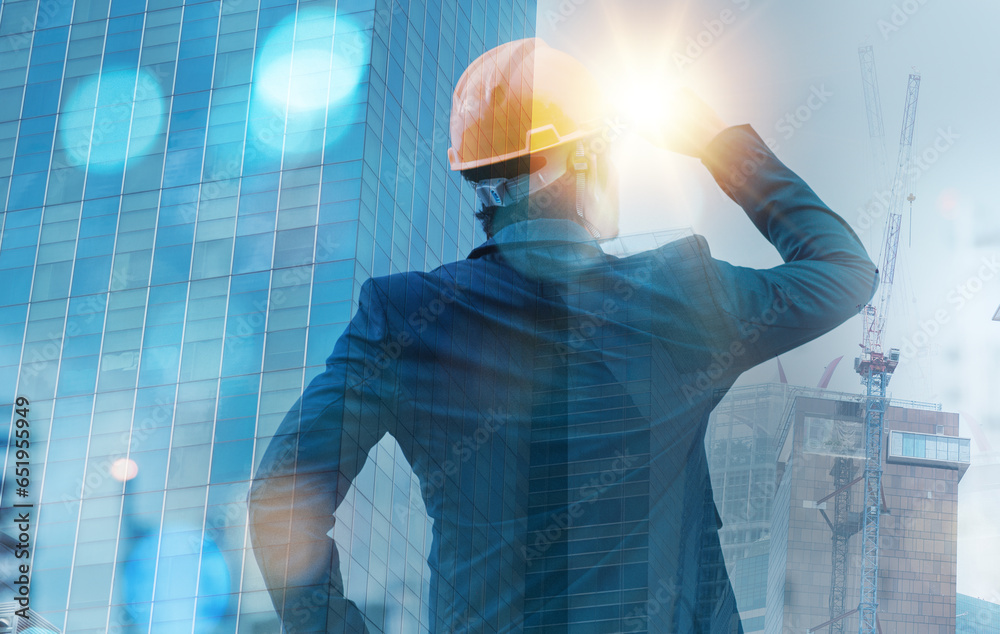 building, architect, blueprint, engineer, builder, contractor, helmet, project, industrial, structure. foreman equimented helmet and thinking for future. building architect background is showed.