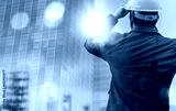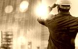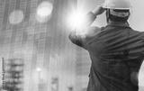 building, architect, blueprint, engineer, builder, contractor, helmet, project, industrial, structure. foreman equimented helmet and thinking for future. building architect background is showed.