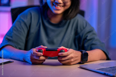 Young asian woman enjoy playing video game by talking on headphones in living room at night.
